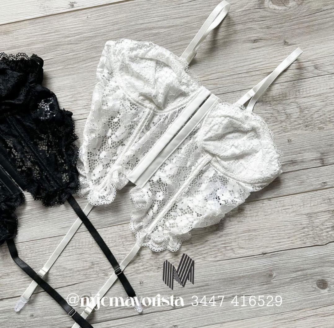 Corset importado con portaligas, de encaje y espalda de microtul, con varillas prende al frente, breteles regulables. Color disponible blanco y negro . Talle unico: M